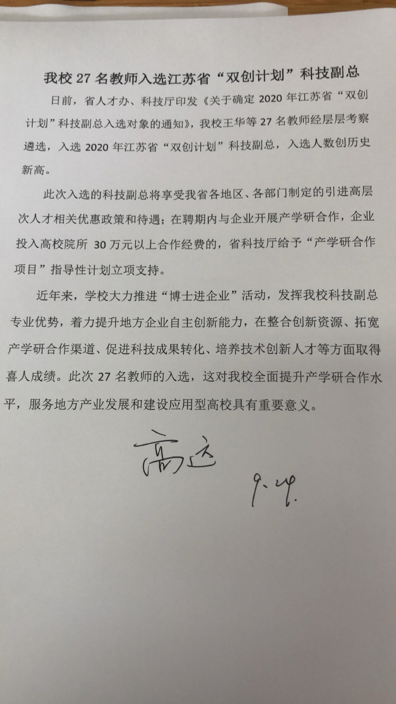 坐标网讯 日前,省人才办、科技厅印发《关于确定2020年江苏省“双创计划”科技副总入选对象的通知》,beat365王华等27名教师经层层考察遴选,入选2020年江苏省“双创计划”科技副总,入选人数创历史新高。此次入选的科技副总将享受我省各地区、各部门制定的引进高层次人才相关优惠政策和待遇;在聘期内与企业开展产学研合作,企业投入高校院所30万元以上合作经费的,省科技厅给予“产学研合作项目”指导性计划立项支持。近年来...