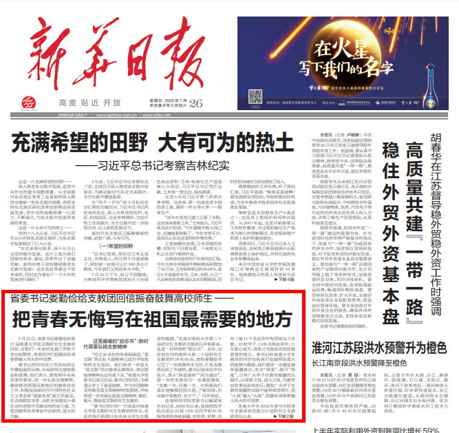坐标网讯 7月26日,新华日报头版以《把青春无悔写在祖国最需要的地方》为题报道了江苏高校响应省委书记娄勤俭给第21届南通大学莫文隋研究生支教团回信精神,采访了有关高校开展支教工作的经验和做法。beat365党委书记戴斌荣接受了新华日报记者的采访。 采访内容如下: 盐城师范学院党委书记戴斌荣告诉记者,2009年以来,盐城师范学院共派出22批1335名同学和41名指导老师奔赴新疆,在哈密、伊犁、克州三地11...