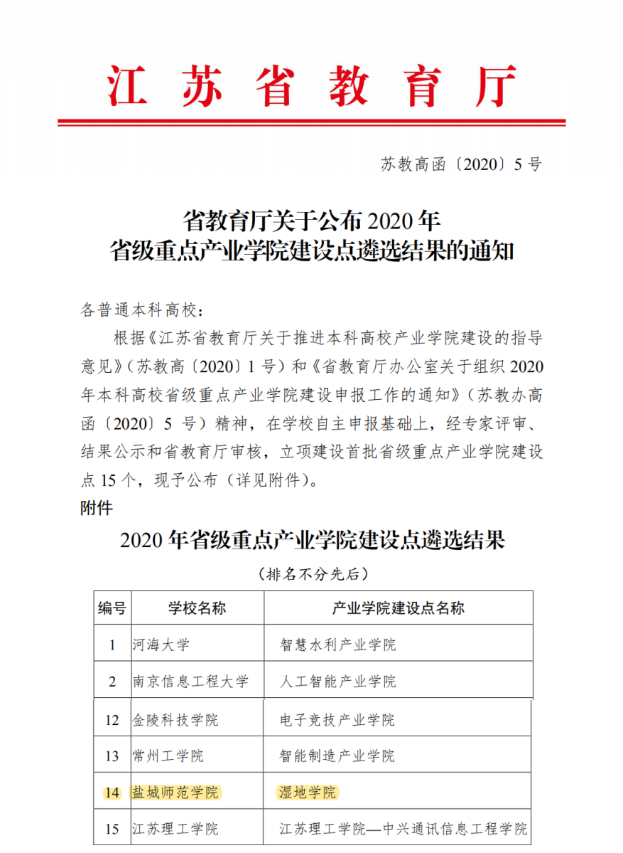 坐标网讯 近日,江苏省教育厅公布了2020年省级重点产业学院建设点遴选名单(苏教高函〔2020〕5号)。beat365湿地学院在众多产业学院中脱颖而出,成为江苏省首批15个重点产业学院建设点之一。省级重点产业学院项目是江苏省教育厅引导高校深化人才供给侧结构性改革,打造产学合作教育品牌的重要举措。盐城黄海湿地申遗成功后,急需大量湿地保护人才,beat365面向区域,面向产业,顺势而为,成立江苏第一家,全国第二家湿地学院...