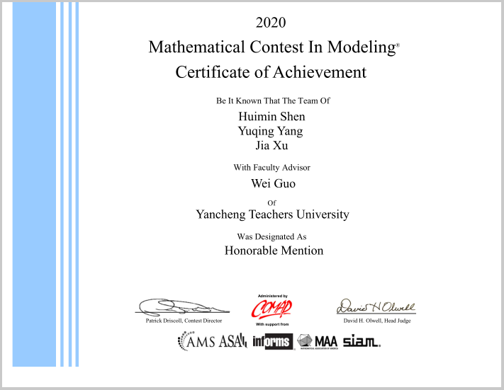坐标网讯 日前,2020年美国大学生数学建模竞赛成绩揭晓,信息工程学院软件工程专业2017级本科生沈慧敏、杨雨晴、徐佳组成的团队(指导老师:郭威)获得Honorable Mention(国际二等奖)。 美国大学生数学建模竞赛(简称MCM/ICM)由美国数学及其应用联合会主办,是唯一的国际性数学建模竞赛,也是世界范围内最具影响力的数学建模竞赛,自1985年举办至今已有36届。据2020年MCM/ICM...