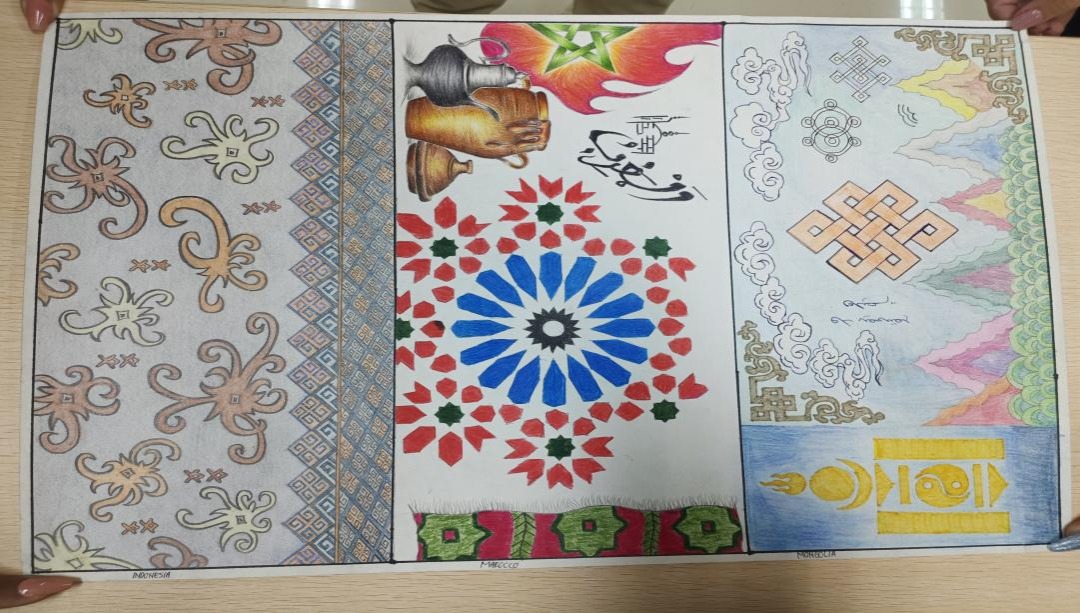 活动中,五个小组各显神通。第一组以照片秀开场,他们将来自巴基斯坦、蒙古国、摩洛哥和坦桑尼亚4个国家的饮食、服装等文化元素的照片打印在白色衣物上,以整齐的排版吸引大家眼球,每张照片都是一段故事。第二组的同学将手绘特色建筑图与精彩的 ppt 展示相结合,呈现出印度、摩洛哥、乌兹别克斯坦和孟加拉4个国家的特色建筑,让观众仿佛身临其境。第三组的手绘图案充满了艺术气息,用印度尼西亚、摩洛哥和蒙古国常见的图案组成美丽画卷,创意十足。第四组通过视频介绍利比里亚、缅甸和孟加拉国风俗,手工树更是体现了同学们卓越的创新能力。第五组的视频展示也别具一格,同学们侃侃而谈,对来自一带一路国家文化都有着独到见解。评委老师们对同学们的表现给予了高度评价并进行了评奖,最终第三小组手绘画卷脱颖而出,荣获第一名。