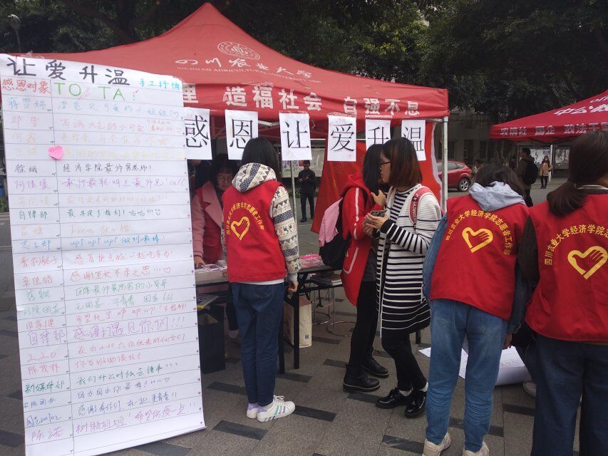 中午,新葡的京集团团委志工部的11位成员在食堂小广场举办了“让爱升温,传递感恩”的感恩活动。此次活动通过丰富的线上线下表白的形式展开,使同学们得到了一次“知恩、感恩、施恩”的深刻教育,引导同学们对人好、对学校好、对社会好,以奉献社会为终身追求,贯彻了习近平总书记要求大家牢记并积极践行的“中国青年新一代应该有理想、有担当”的理念。活动最后,宣传板上贴满了满满的祝福语和感恩语,不仅增强了同学们的感恩意识,也提高了同学们的综合素质,使大家更深刻的认识到感恩的意义所在。